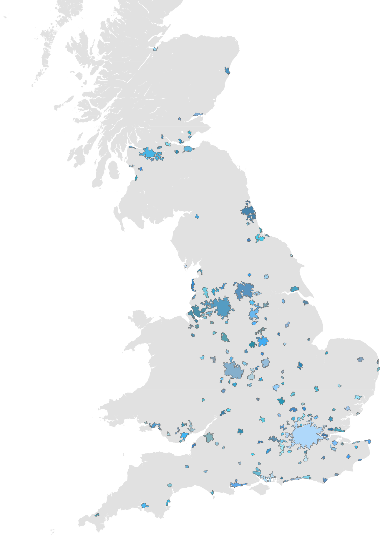 As the LuminoCity3D website is designed for displaying urban maps and data, this threshold is judged to be acceptable. This approach does however mean that 15% of the GB population living in villages and rural areas are not shown on the map.