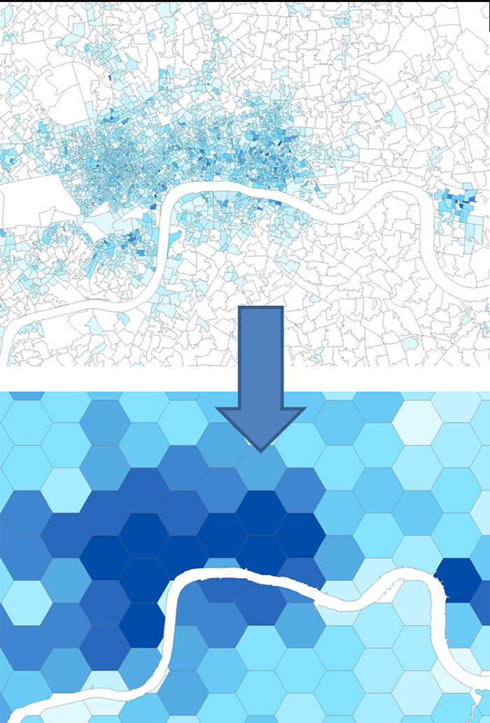 Workplace employment density. Above workplace zone data is transformed to the more aggregate hexagon zone grid below.