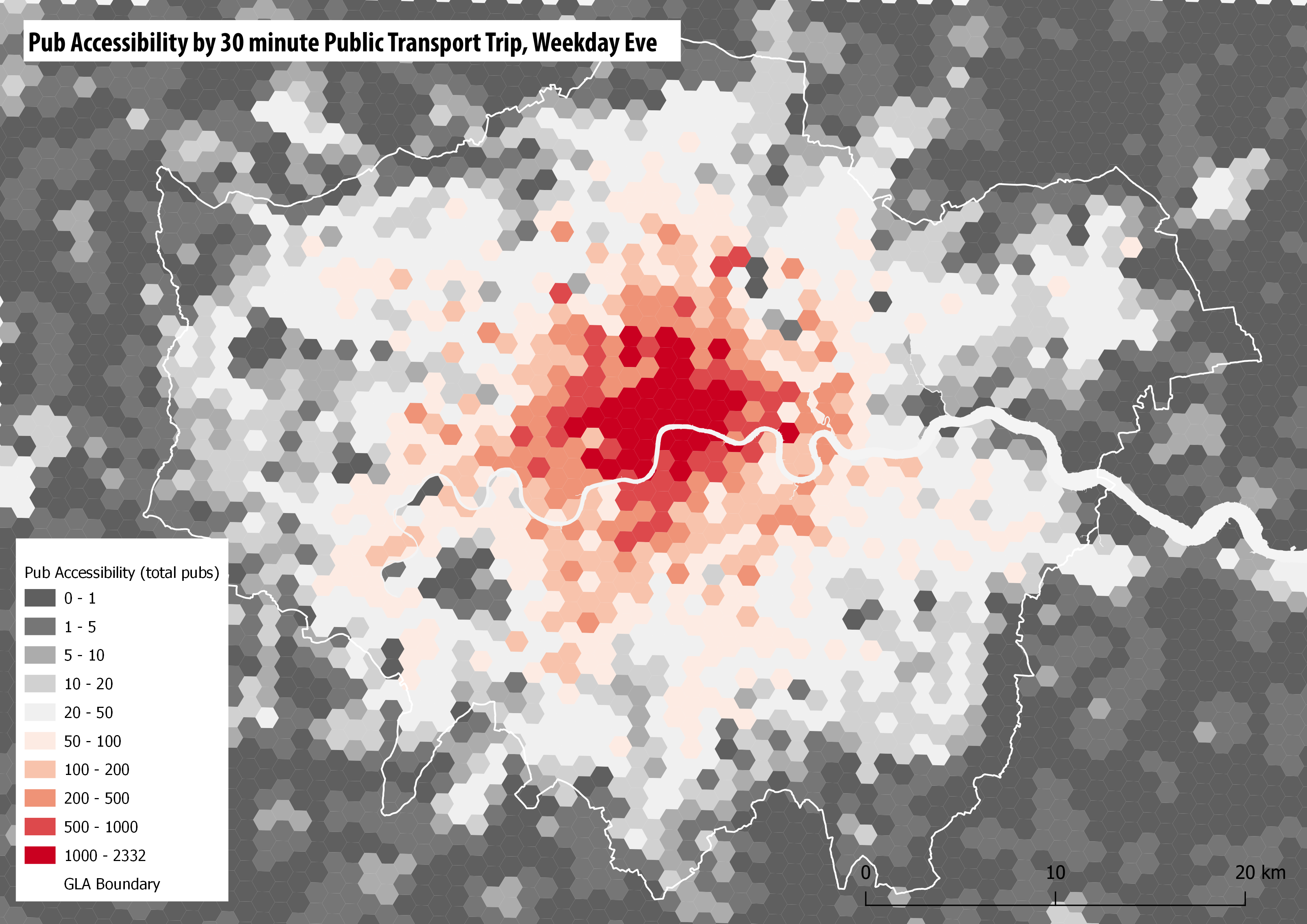 When you build a larger model, there are more likely to be some errors. So in the above map, Reading to the west looks too low density, perhaps because the train station has not linked successfully with the street network, or local bus services are not being captured. These are the kind of issues you might have to try and sort out in your model.