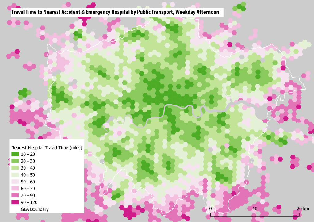 We can also repeat the nearest hospital analysis with the London model. The Point of Interest data is from the Ordnance Survey POI, which enables specifying hospitals with Accident & Emergency services. You can see that Greater London has good hospital coverage-