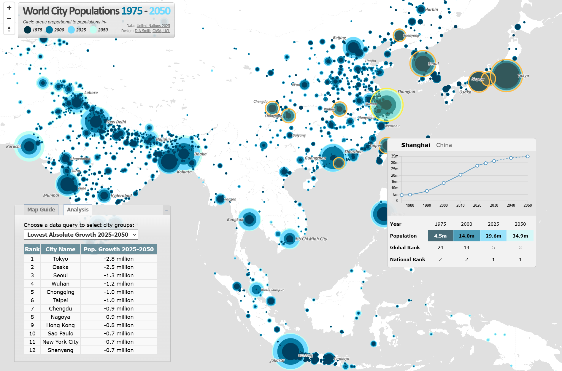 The World Population Density map includes density statistics at national and city scales, with population totals classified into density groups (turn on the Interactive Statistics button at the top left). These help to identify differences in patterns of settlement, and how city densities relate to national distributions.